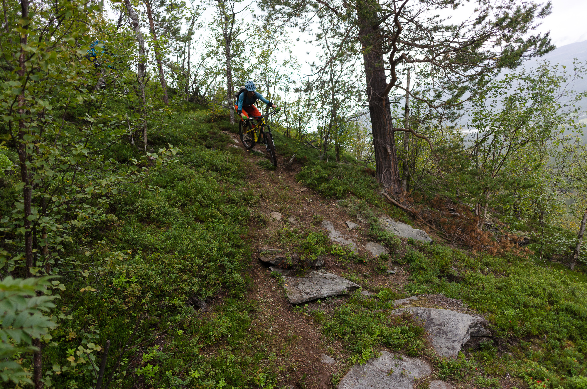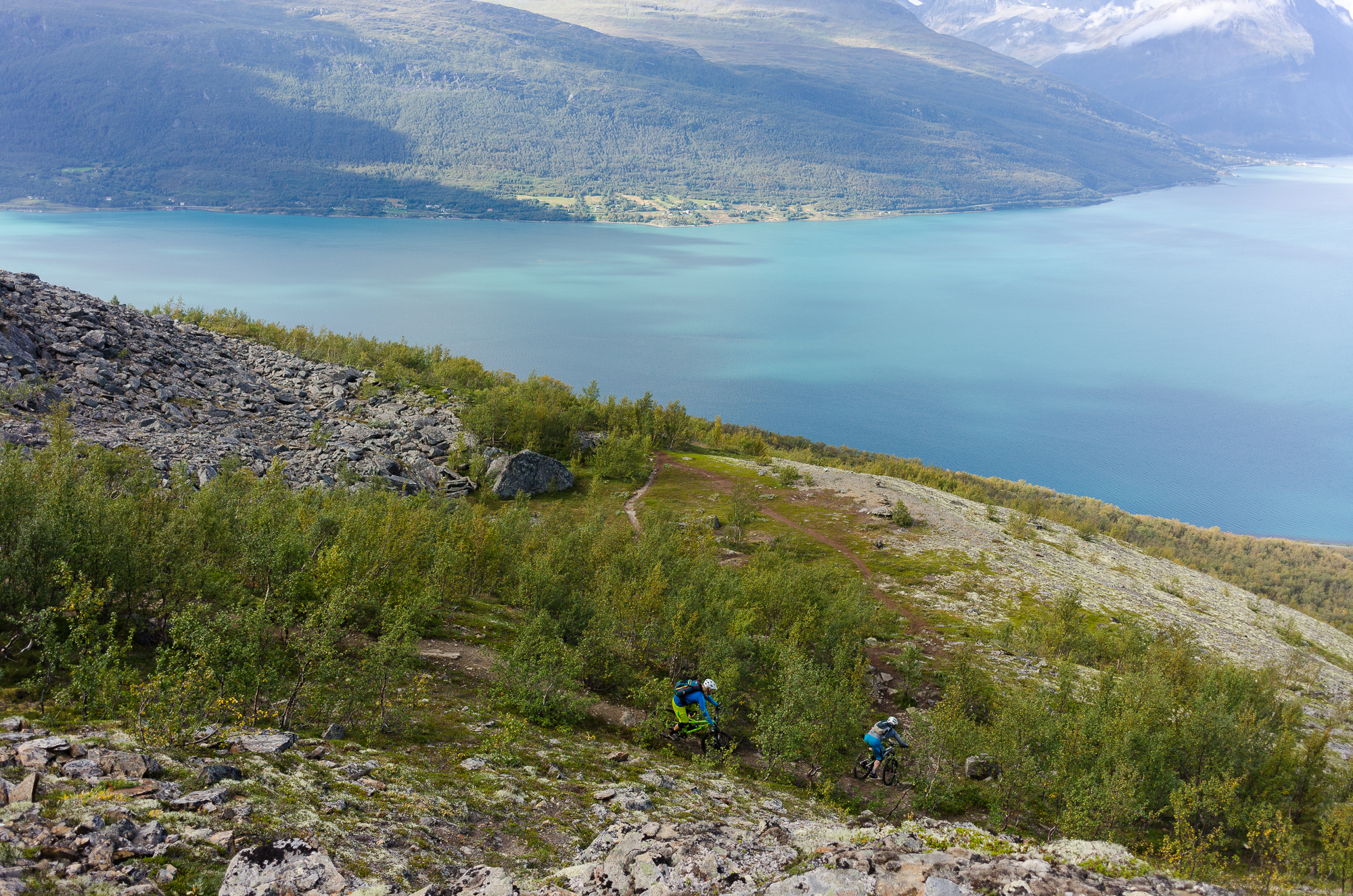 Having survived the descent, most of our group made the sensible decision to call it a day and head back to camp. On the other hand, I could not bring myself to leave without also descending the other side, that is the old spooky road we climbed earlier. Stian and Gustav did not really need any persuasion, and soon enough we found ourselves climbing back up the same way we came down. The steepness of that trail really came to it's own when we tried to scramble up it with bikes on our shoulders, this might well be the trail with most sustained steep fall line riding I have ever ridden. The only reason it is rideable at all that it is located in a tiny village in the arctic, and as such sees very little traffic. IMBA would not just be offended, they would probably run home crying.